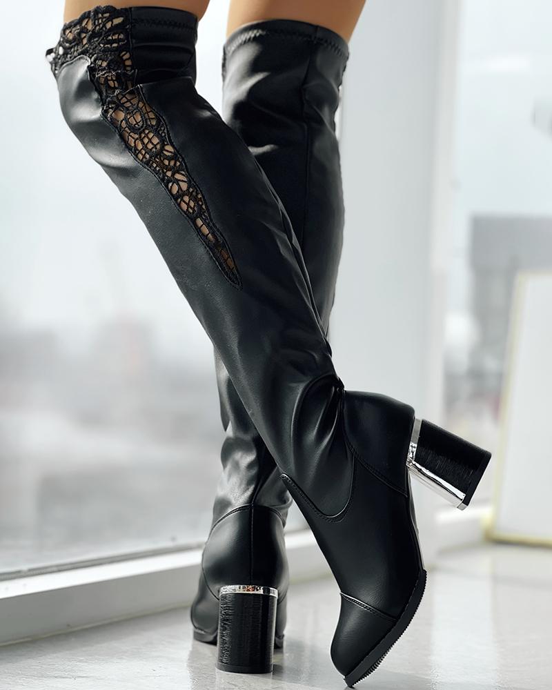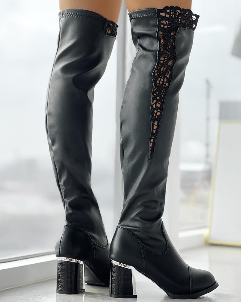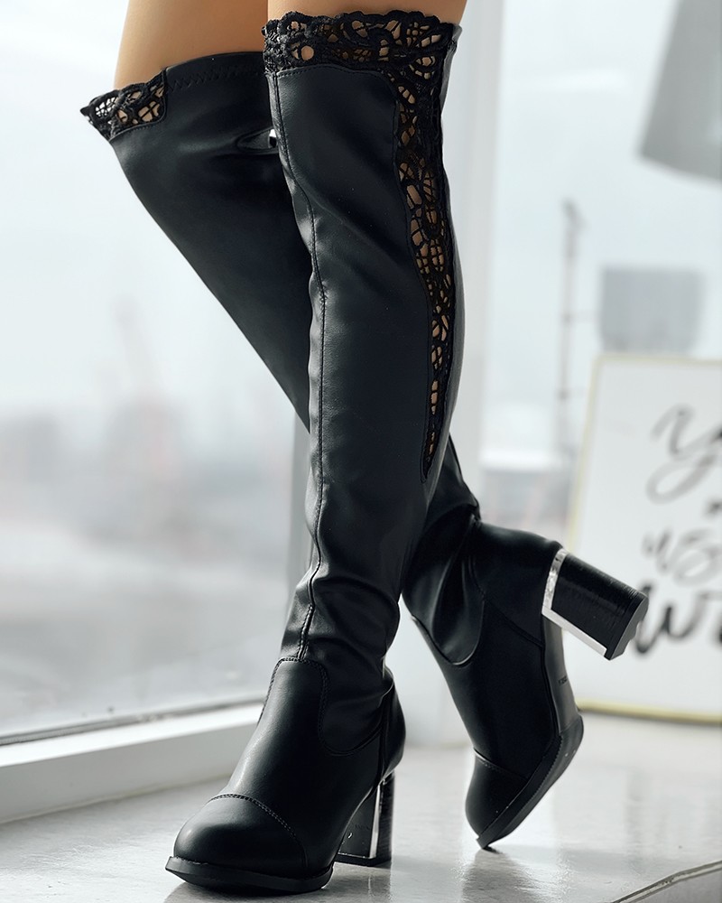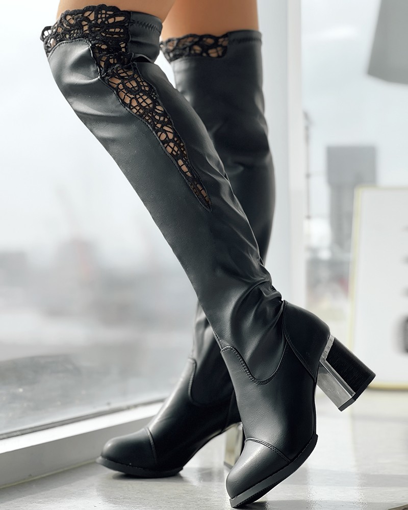 Contrast Lace Chunky Heel Over The Knee Winter Boots