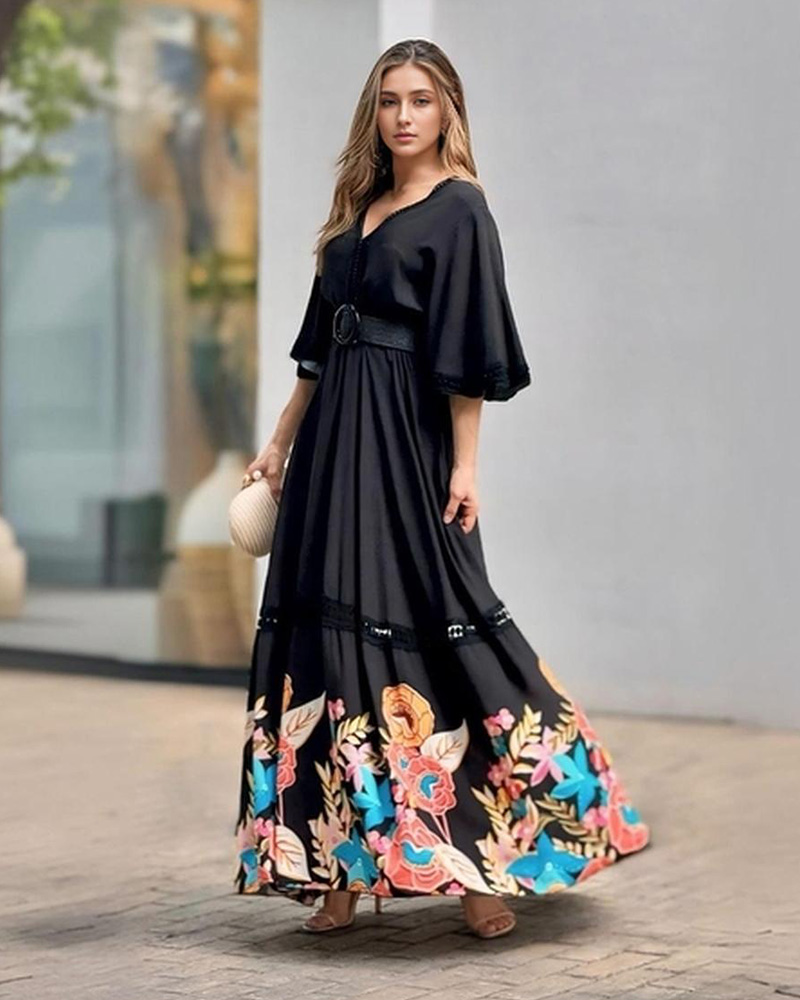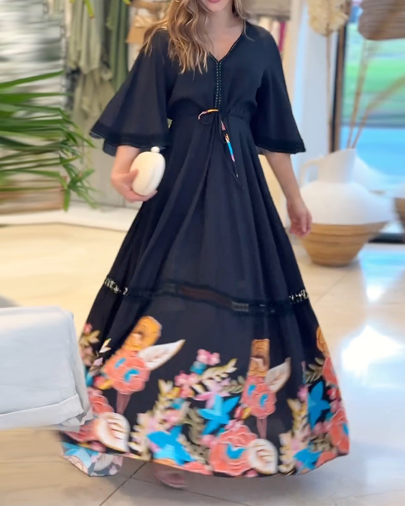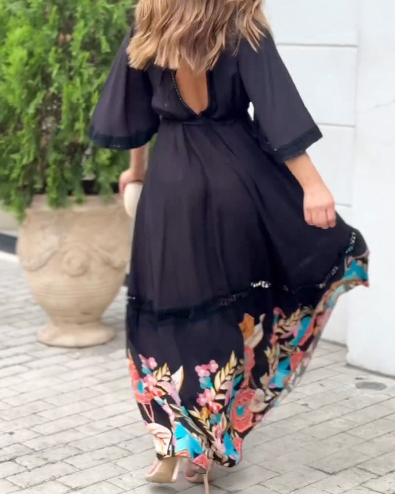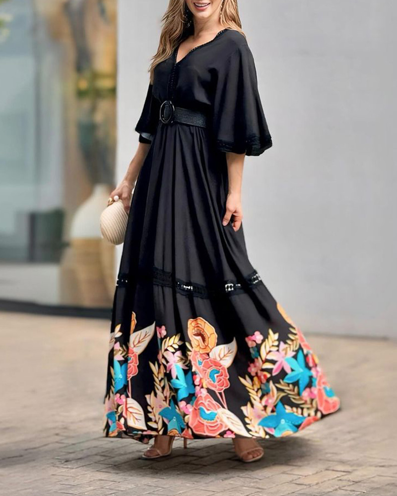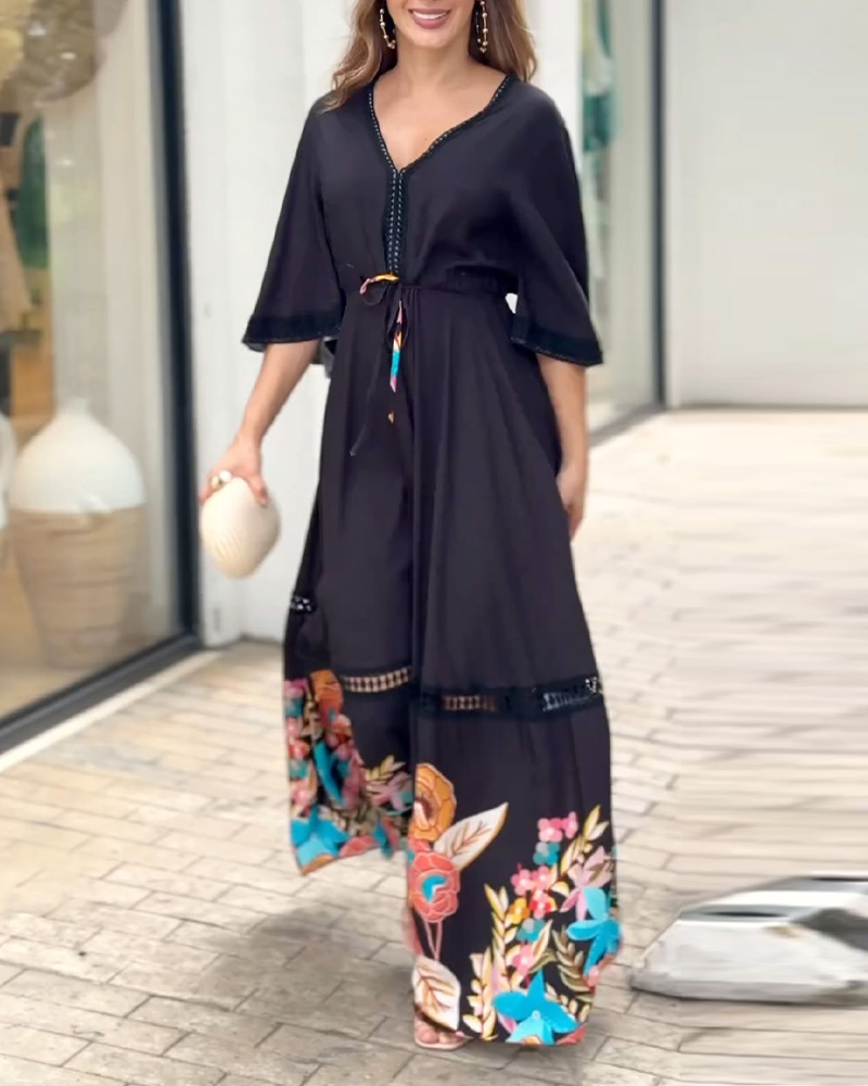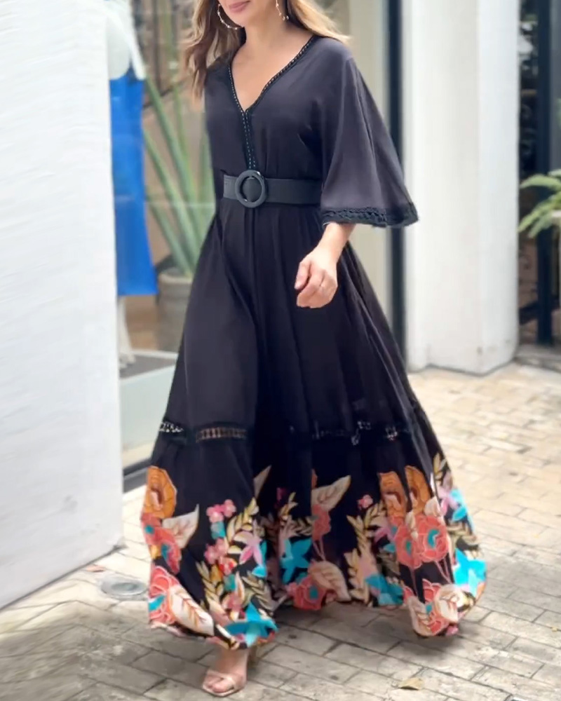 Product Name: Lace Spliced Hem Printed Maxi Dress(Without Belt)